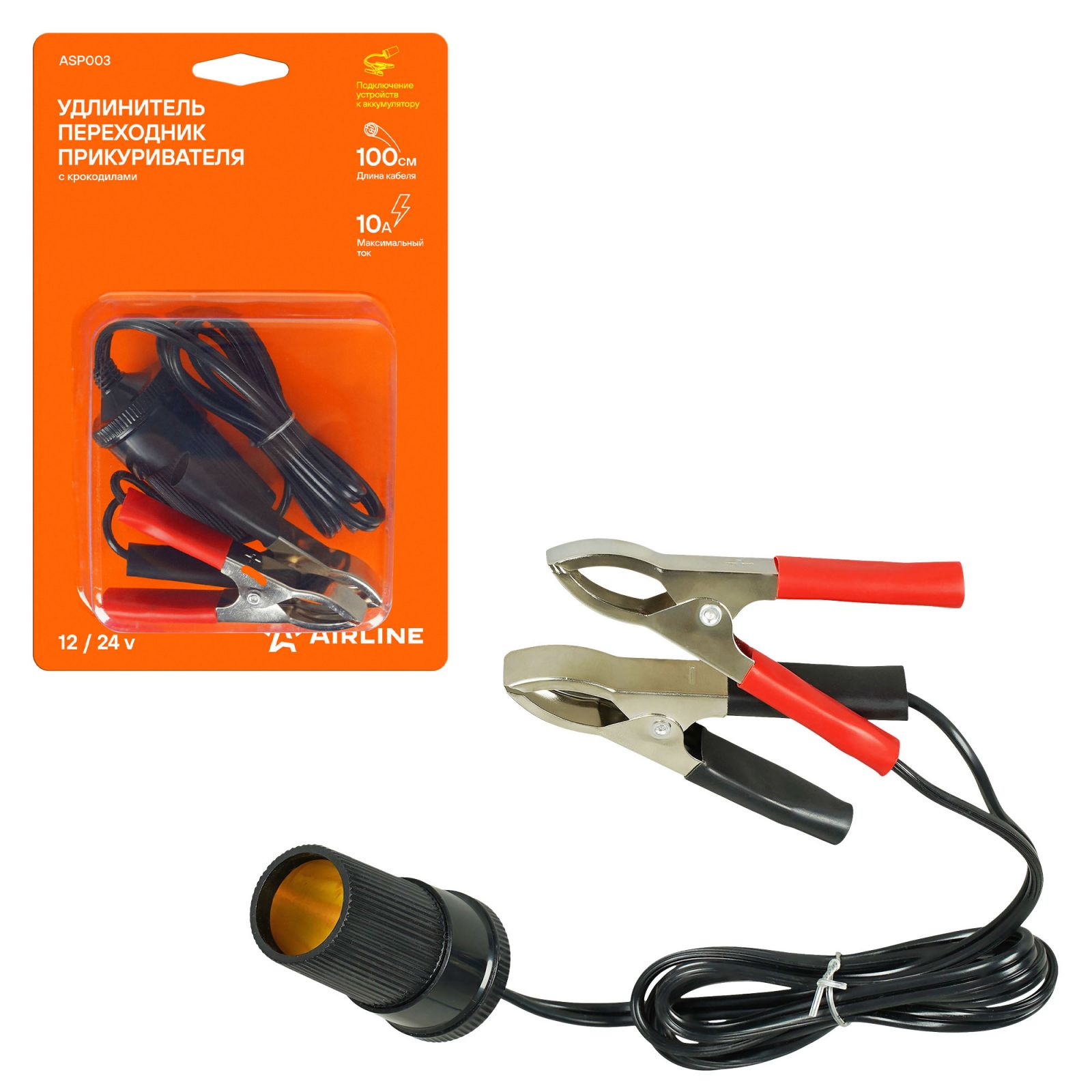 Удлинитель переходник прикуривателя с крокодилами 10А, кабель 100 см (ASP003)