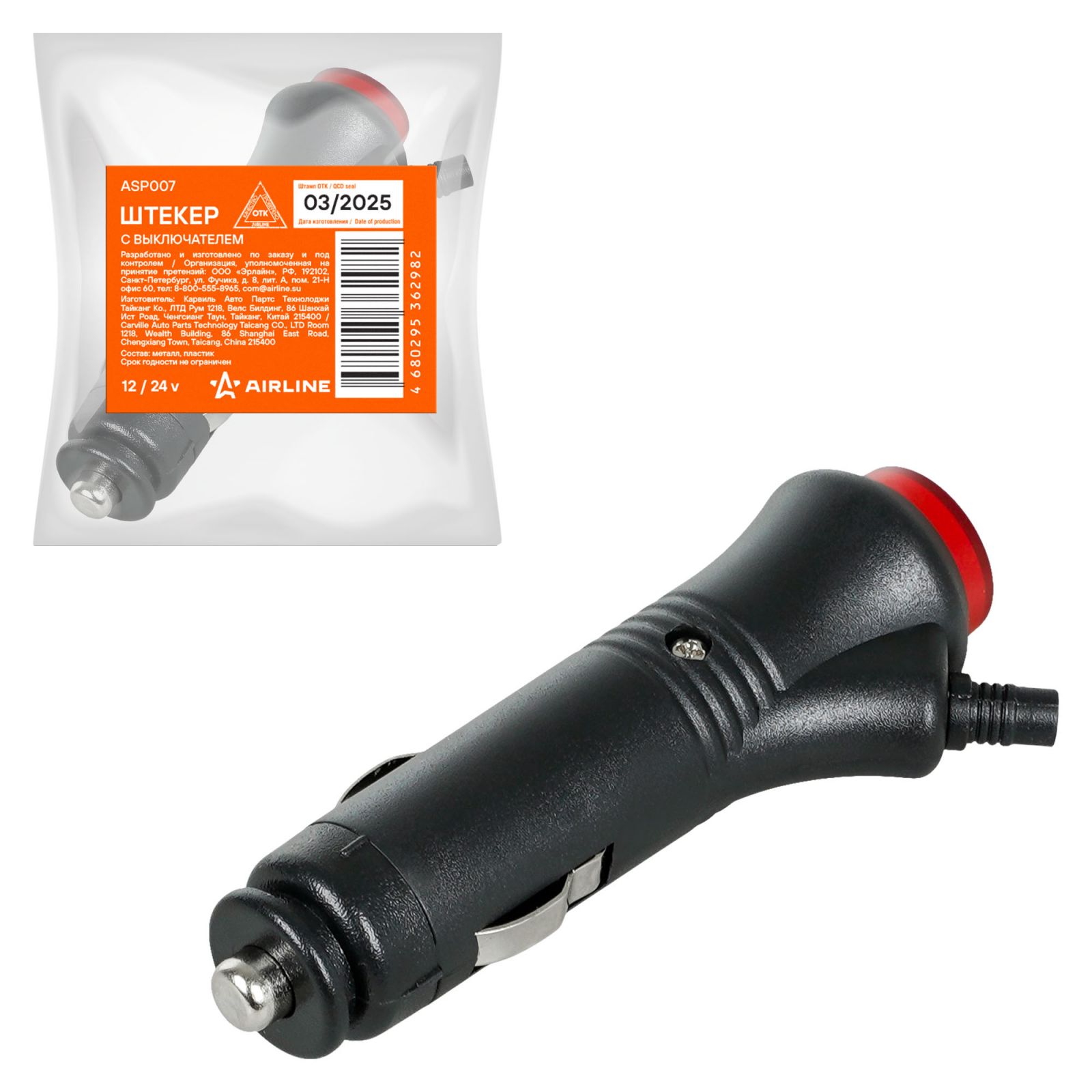 Штекер 12/24В, предохранитель 3А, с выключателем (ASP007)
