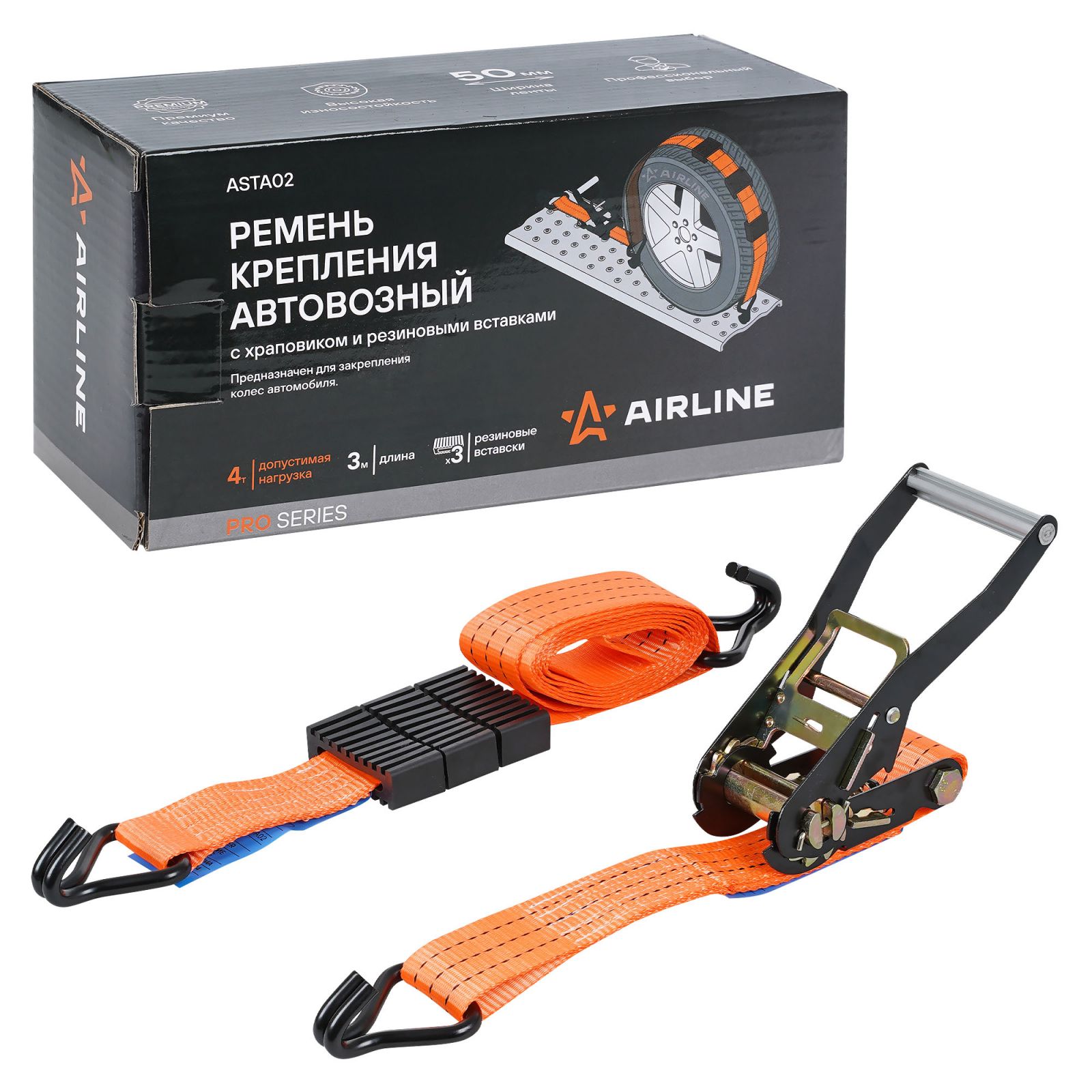 Ремень крепления автовозный с храповиком и резиновыми вставками 4 т, 3 м (ASTA02)