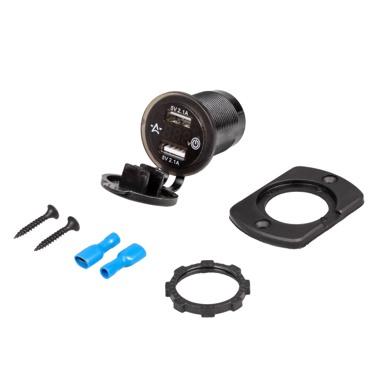 Розетка USB встраиваемая влагозащ. с 2 портами и вольтметром (вкл/выкл) (5В, 2.1А + 2.1А) (AEBJ203)