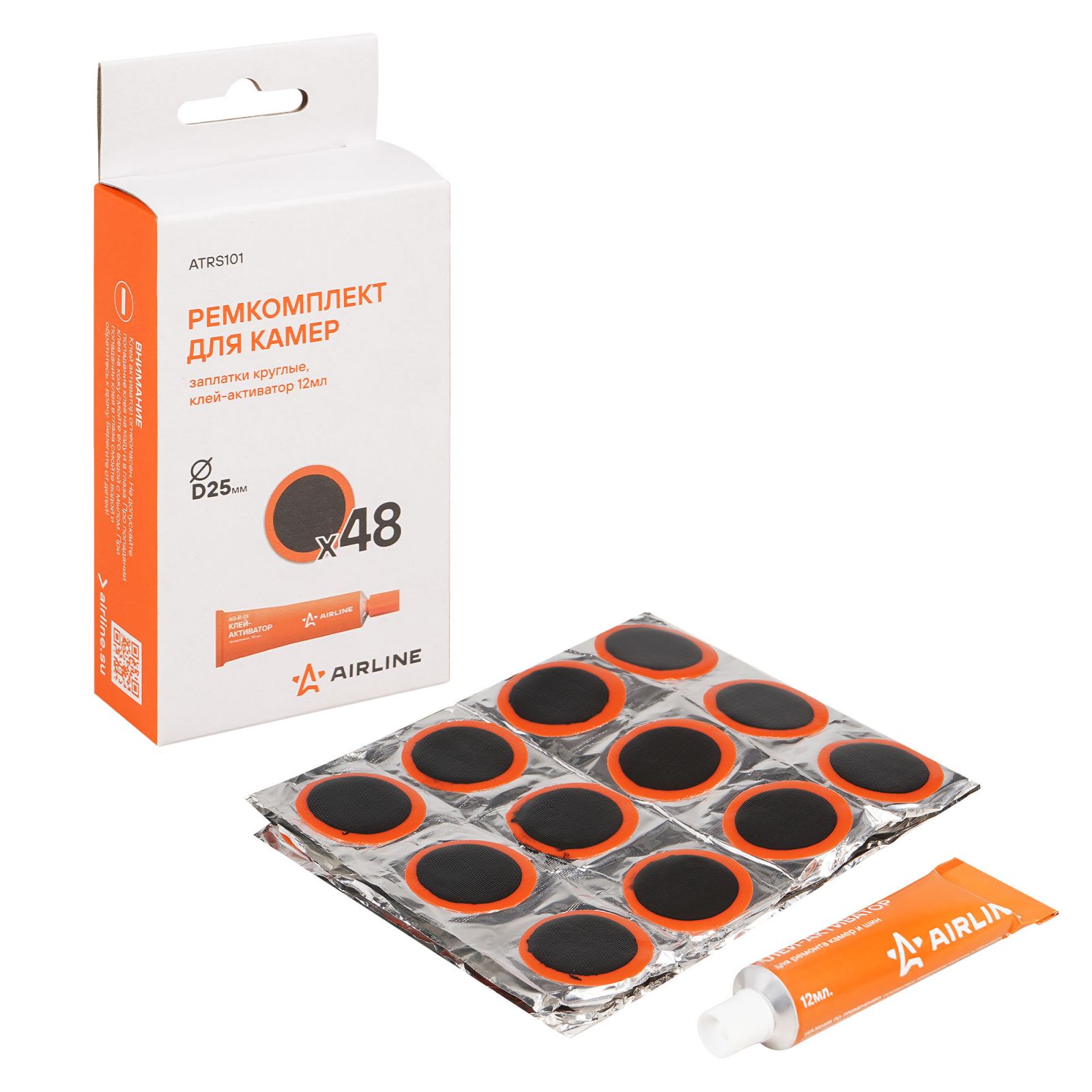 Ремкомплект для камер, заплатки круглые D25 мм - 48 шт., клей-активатор 12мл (ATRS101)