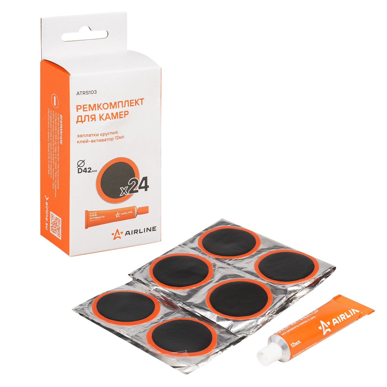 Ремкомплект для камер, заплатки круглые D42 мм - 24 шт., клей-активатор 12мл (ATRS103)
