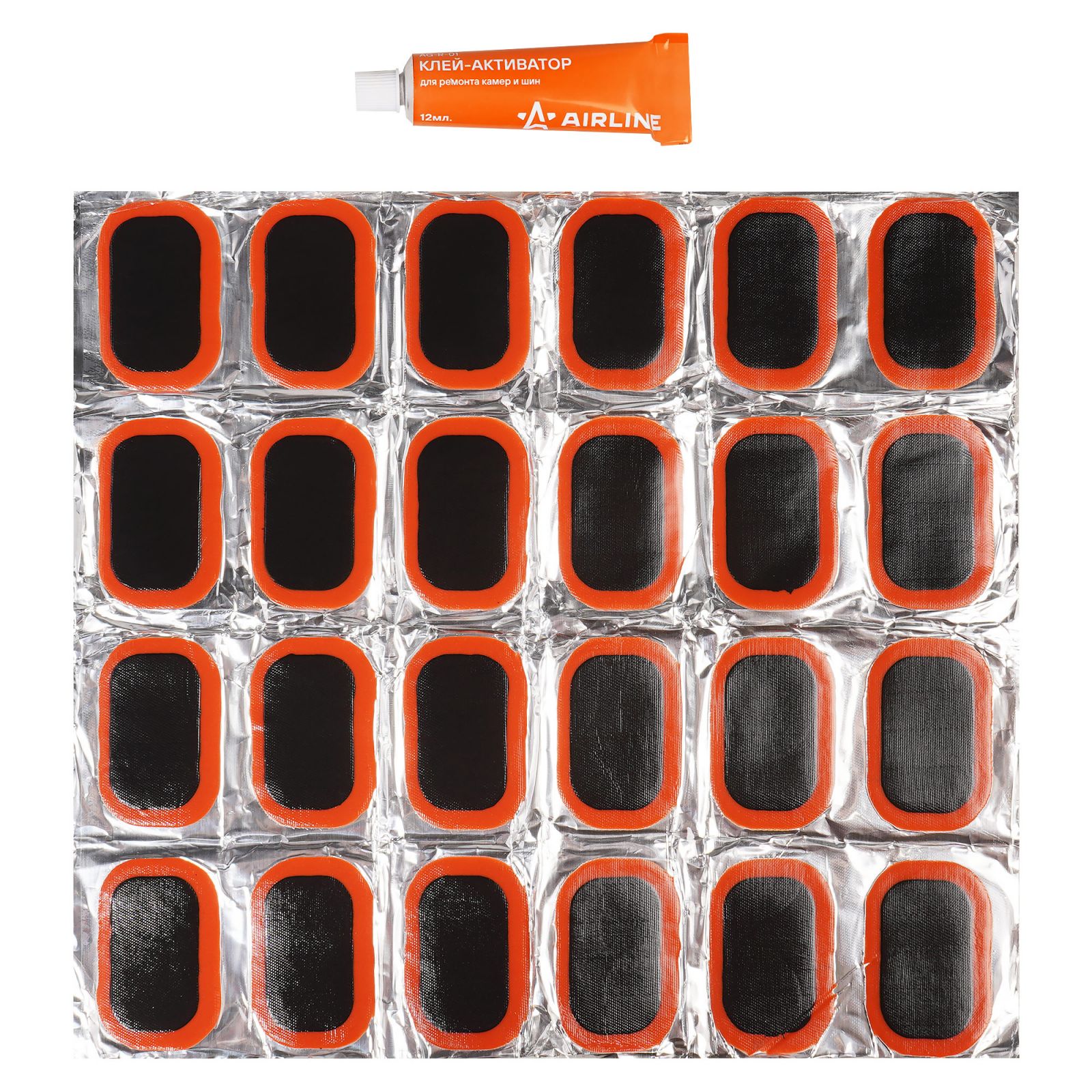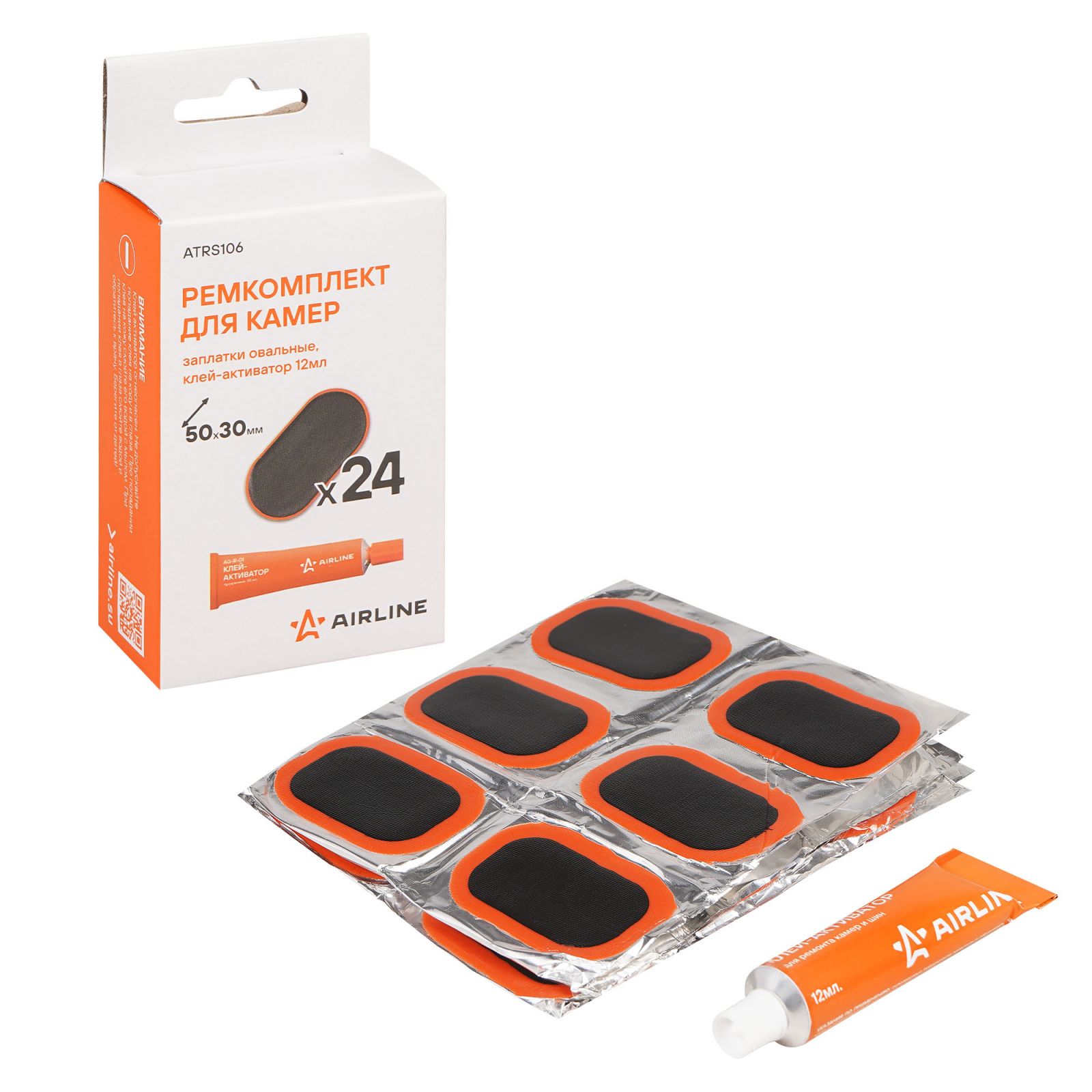 Ремкомплект для камер, заплатки овальные 50*30 мм - 24 шт., клей-активатор 12мл (ATRS106)