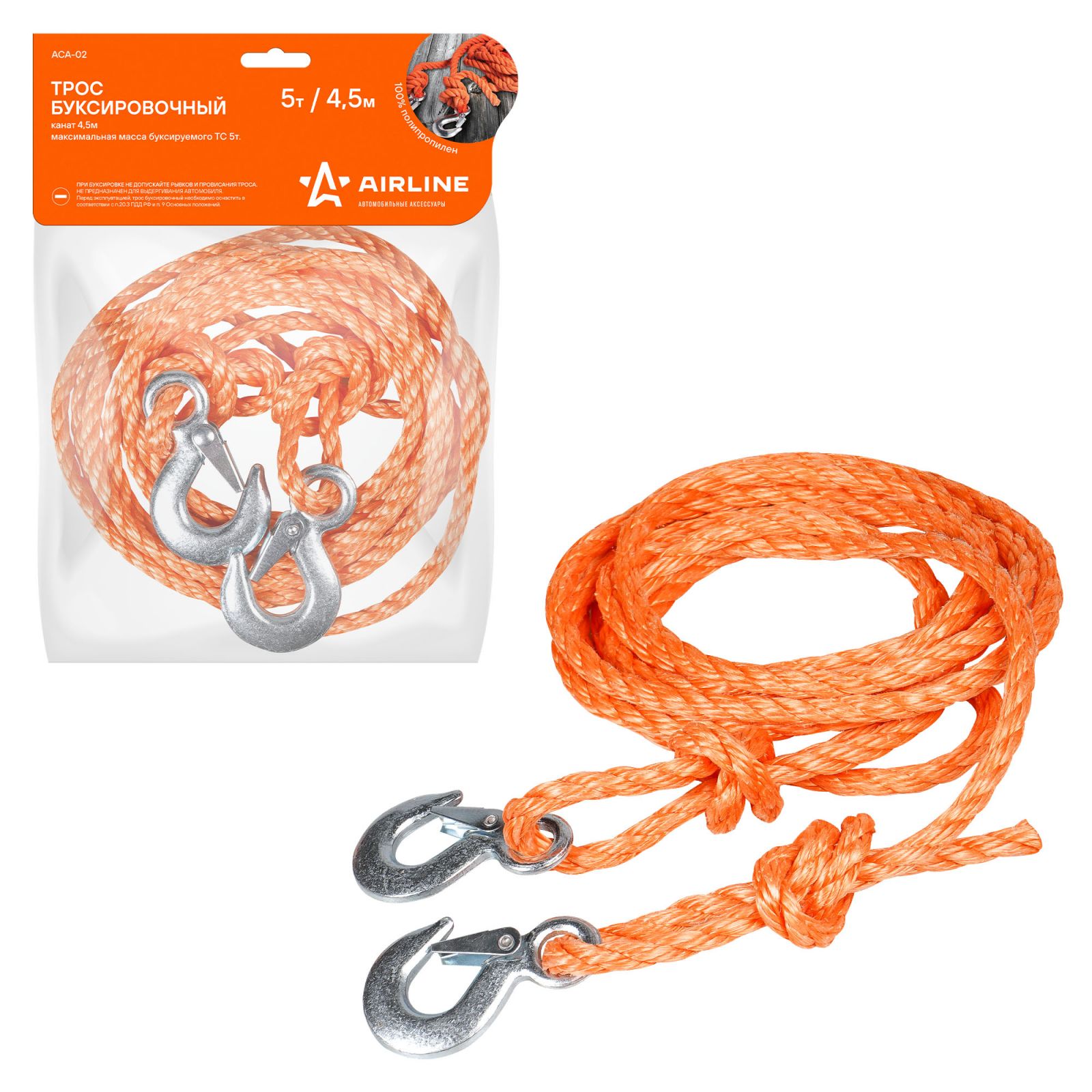 Трос буксировочный канат 5 т, 4,5 м, 2 крюка (ACA-02)