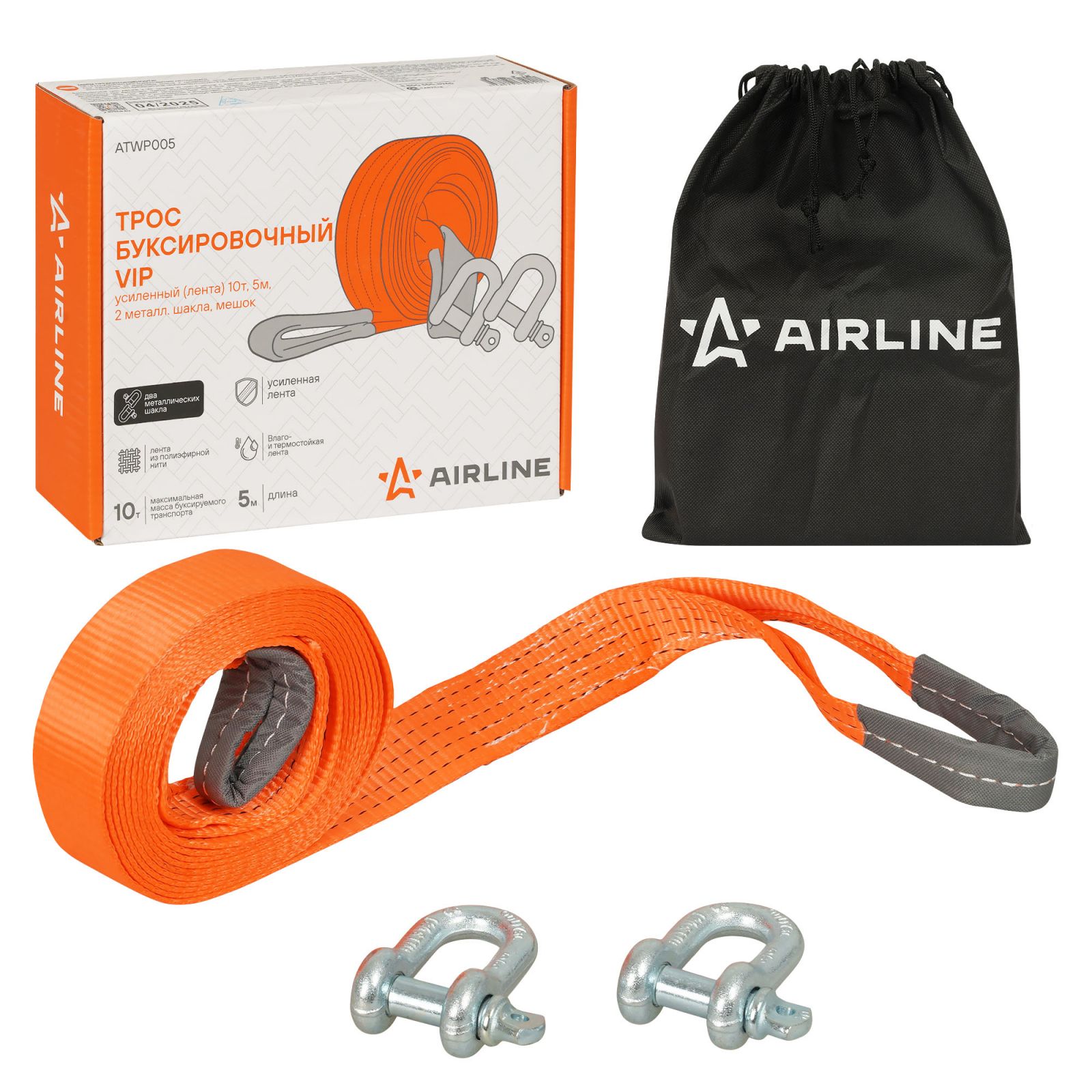 Трос VIP буксировочный усиленный (лента) 10т, 5м, 2 металл.шакла, мешок (ATWP005)