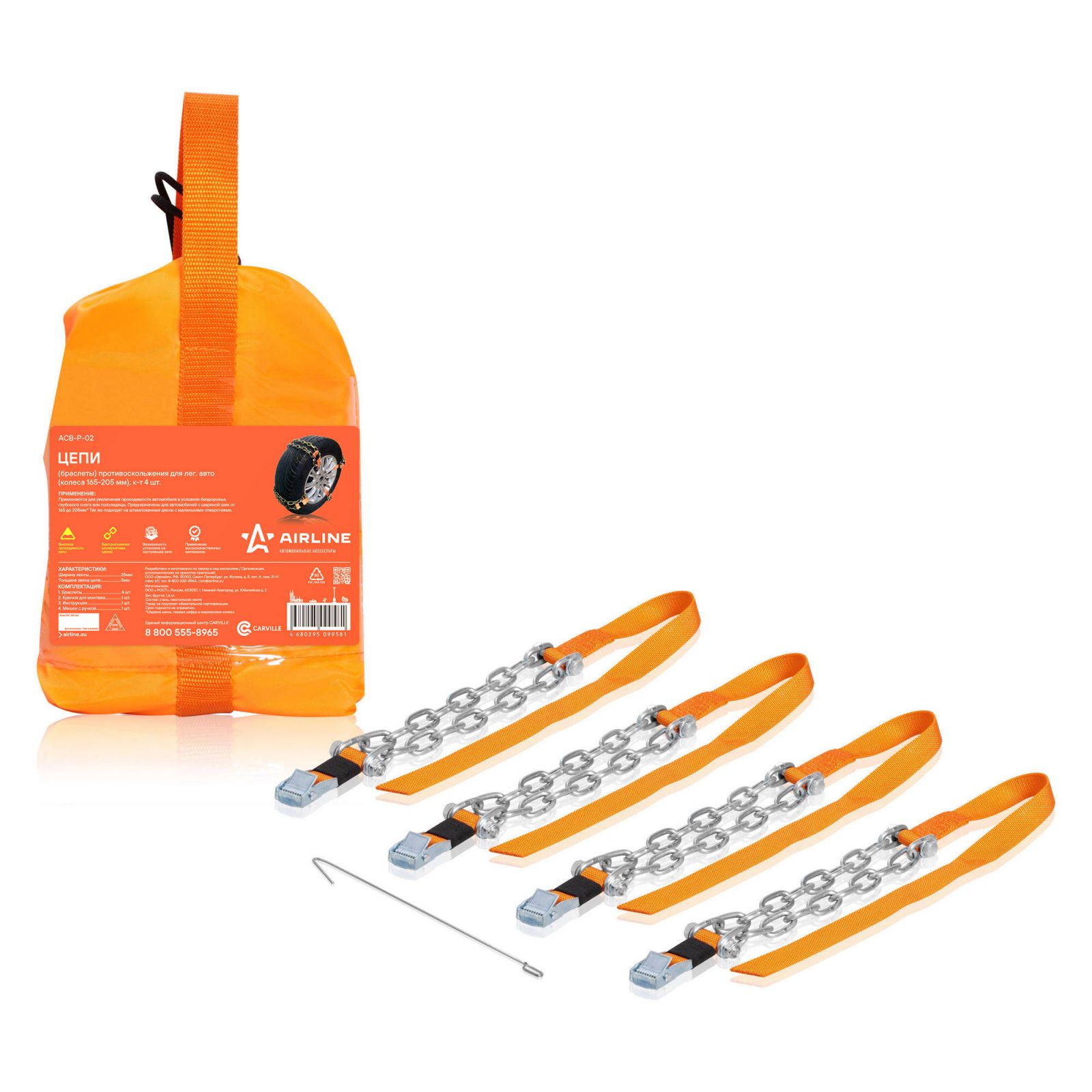 Цепи (браслеты) противоскольжения для лег.авто (колёса 165-205 мм), к-т 4 шт.(ACB-P-02)