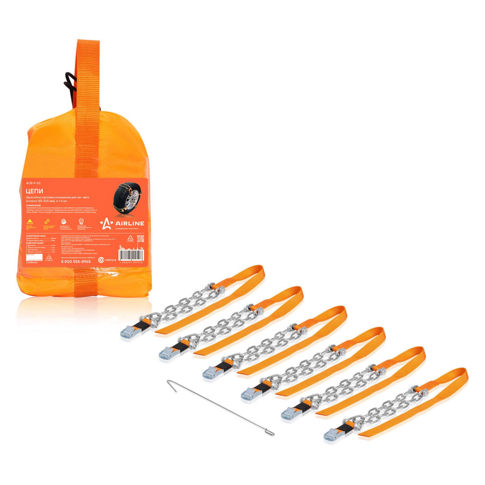 Цепи (браслеты) противоскольжения для лег.авто (колёса 165-205 мм), к-т 6 шт.(ACB-P-03)
