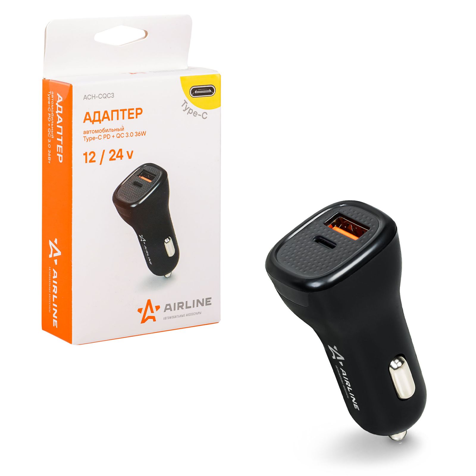 Адаптер автомобильный Type-C PD + QC 3.0 36Вт, 12/24В (ACH-CQC3)